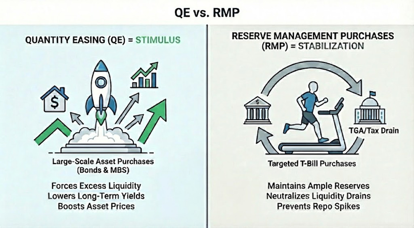 However, this is a stabilizer, not a stimulus. Because RMP merely replaces the liquidity being drained by the TGA rather than expanding the net monetary base, it should not be mistaken for the systemic easing of true QE.