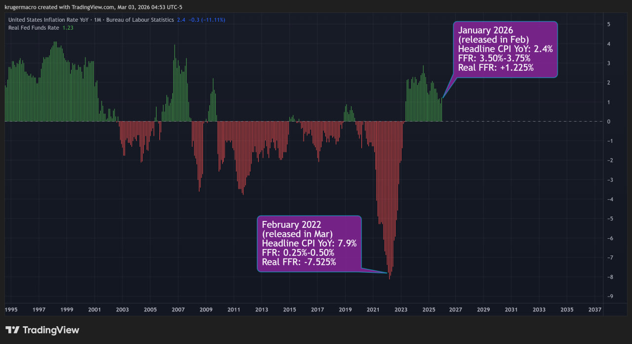 Even if the oil spike pushes headline inflation temporarily higher, the Fed has room to look through it. At +1.2% real rates, they don't need to tighten into a supply shock. In 2022 they had no choice — at -7.5% they were catastrophically behind. That's the difference that matters for risk assets.