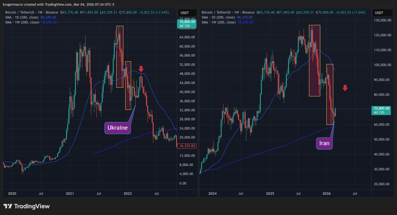 Despite this historical edge, the 2022 comparison has the market's attention. The aftermath looks eerily similar: major energy disruptions, geopolitical shifts, and nearly identical chart patterns across assets — bitcoin being the most striking example.