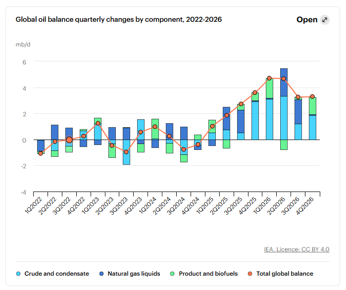 And unlike 2022, the market entered this shock in surplus — the IEA projected an oversupply of nearly 4 million bpd for 2026, global inventories were at a four-year high, and China had been stockpiling crude at roughly 900,000 bpd through most of 2025. The shock is transitory, not structural.